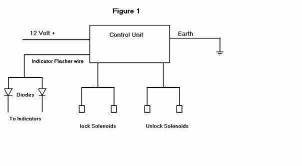 These wires need to be connected to your new lock and unlock solenoids, so both doors work in unison. The control unit and the passenger and driver’s door solenoids now need to be connected up as per the wiring diagram in the control unit’s instruction book marked “Positive Pulse System” (See Figure 1)
